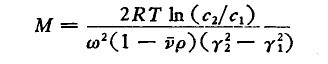 式中R是氣體常數(shù);T是絕對(duì)溫度;s是分子的沉降系數(shù);ν是分子的微分比容(當(dāng)一克溶質(zhì)加到一個(gè)大體積的溶液中所占有的體積);ρ是溶劑的密度以及c2和c1是溶質(zhì)在距旋轉(zhuǎn)中心的γ2和γ1位置上的濃度。