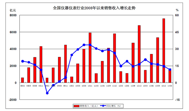 1、全國儀器儀表行業(yè)2008年以來銷售收入增長比較
