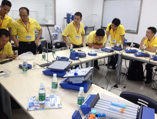 在儀器展示區(qū),IKA技術(shù)人員針對不同產(chǎn)品,就類別、原理、功能、技術(shù)參數(shù)、維修保養(yǎng)技巧,為我們銷售人員做了詳細(xì)解說。并給予現(xiàn)場演示操練時(shí)間。待廣州深華銷售人員徹底了解后,連連稱贊。兩家公司關(guān)系極其融洽。