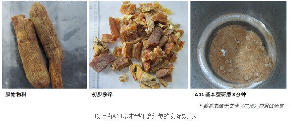 在制備為試樣水解液之前,還有非常關(guān)鍵的一步——粉碎/研磨——直接關(guān)系到紅參中有效成分的釋放。請參考A11基本型對紅參的實際研磨效果: