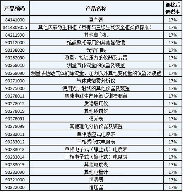 114日,財政部發(fā)布了關于提高機電、成品油等產(chǎn)品出口退稅率的通知。將照相機、攝影機、內(nèi)燃發(fā)動機、汽油、航空煤油、柴油等產(chǎn)品的出口退稅率提高至17%,其中包括了真空泵、質(zhì)譜聯(lián)用儀等實驗室設備。