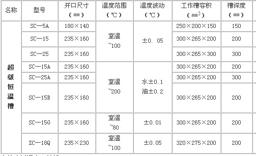 開口尺寸(㎜):180×140; 溫度范圍(℃):室溫~100; 溫度波動(dòng)(℃):±0. 05; 工作槽容積(㎜3):250×200×150; 槽深度(㎜);150。